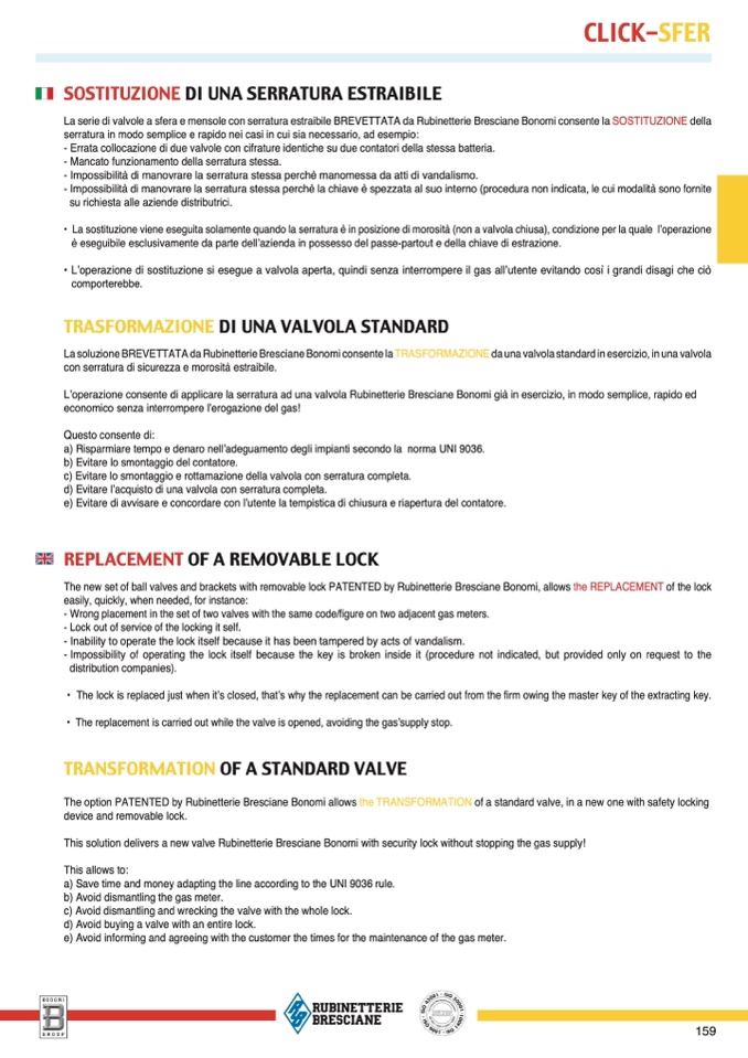 The new set of ball valves and brackets with removable lock PATENTED by Rubinetterie Bresciane Bonomi, allows the REPLACEMENT of the lock