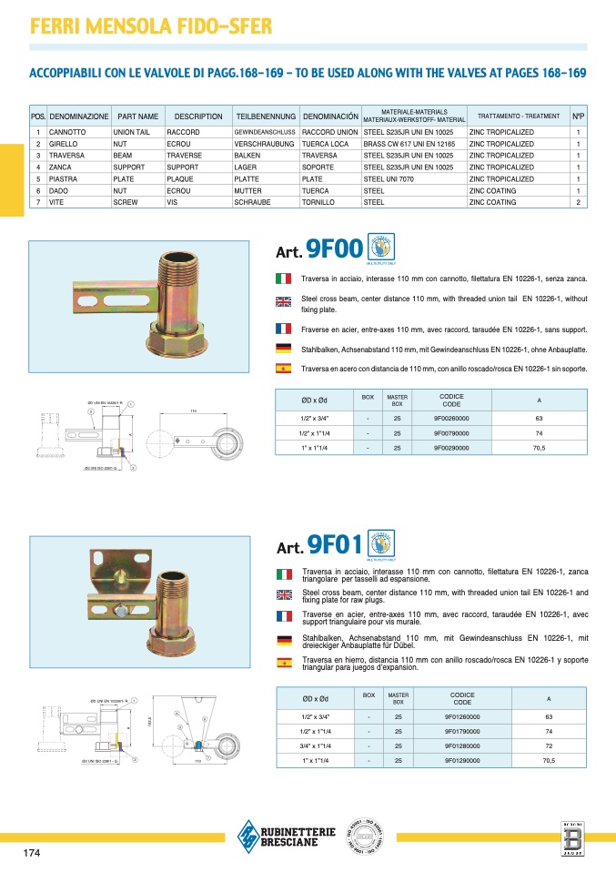 Traversa in acciaio, interasse 110 mm con cannotto, filettatura EN 10226-1, zanca