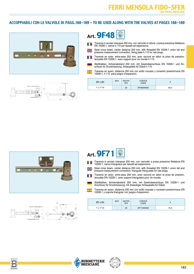 Traversa in acciaio interasse 250 mm, con cannotto e presa pressione filettatura E