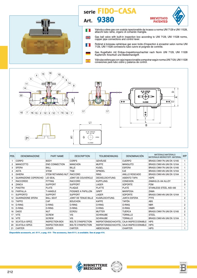 Válvulas esfera gas con caja inspeccionable a empotrar según norma UNI 7129, UNI 11528