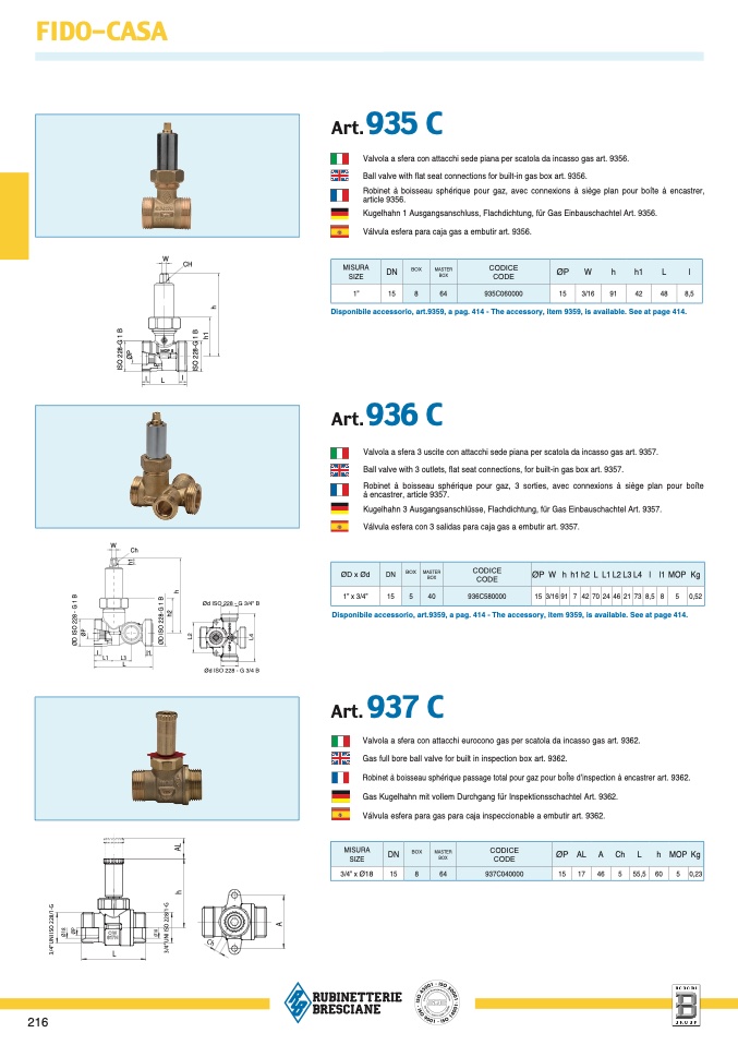 Gas full bore ball valve for built in inspection box art. 9362.