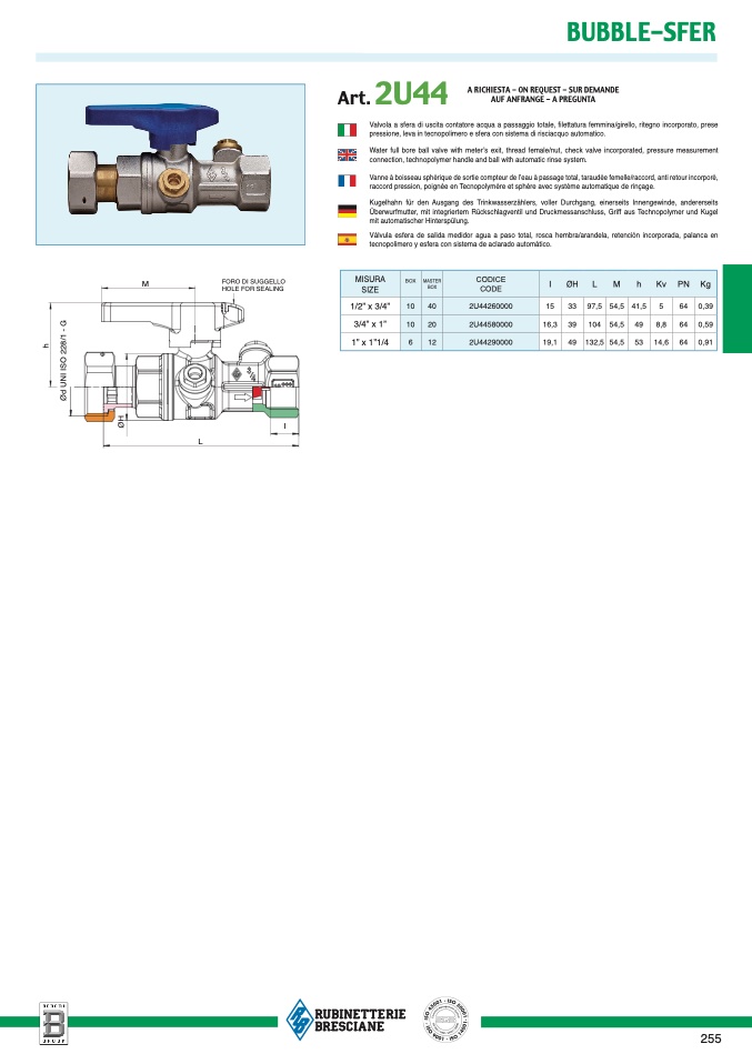 Water full bore ball valve with meter’s exit, thread female/nut, check valve incorporated, pressure measuremen