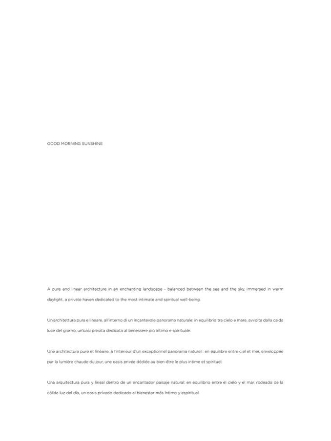 Une architecture pure et linéaire, à l’intérieur d’un exceptionnel panorama naturel : en équilibre entre ciel et mer, enveloppée