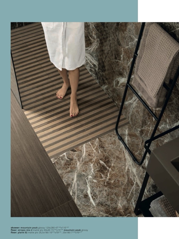 floor: stripes mix 2 matte ptv 40x40 153/4”x153/4” mountain peak gloss