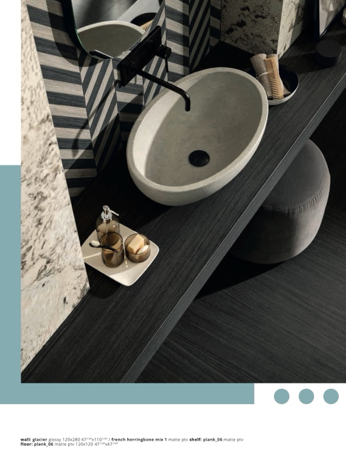 wall: glacier glossy 120x280 471/4”x1101/4” / french herringbone mix 1 matte ptv shelf: plank_06 matte ptv