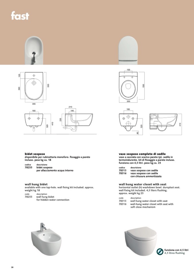 wall fixing kit included. 4,5 liters flushing.