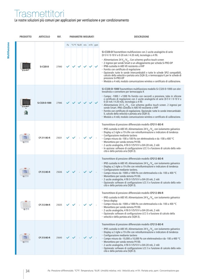 Pa: Pressione differenziale; °C/°F: Temperatura; %UR: Umidità relativa; m/s: Velocit