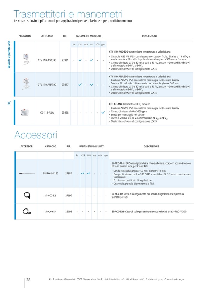 Pa: Pressione differenziale; °C/°F: Temperatura; %UR: Umidità relativa; m/s: Velocit