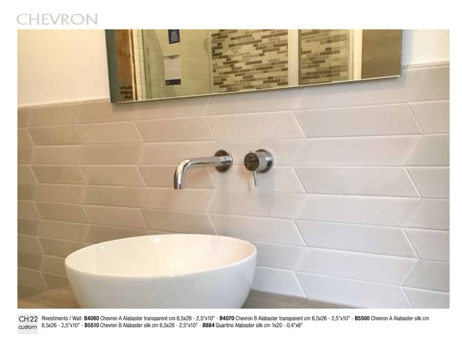 Rivestimento / Wall: B4060 Chevron A Alabaster transparent cm 6,5x26 - 2,5”x10” - B4070 Chevron B Alabaster transparent cm 6,5x26 - 2,5”x10” - B5500 Chevron A Alabaster silk cm