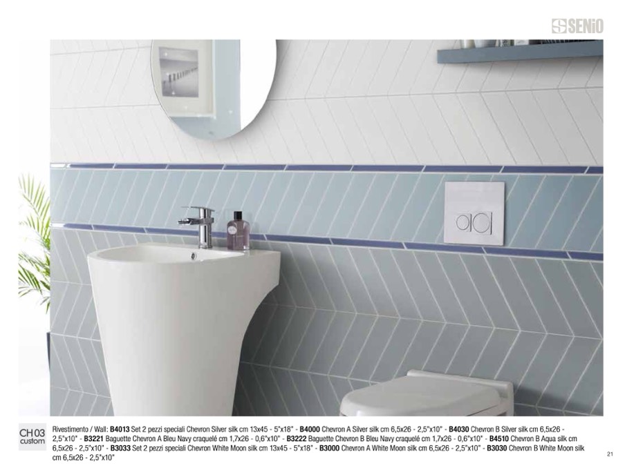 Rivestimento / Wall: B4013 Set 2 pezzi speciali Chevron Silver silk cm 13x45 - 5”x18” - B4000 Chevron A Silver silk cm 6,5x26 - 2,5”x10” - B4030 Chevron B Silver silk cm 6,5x26 -