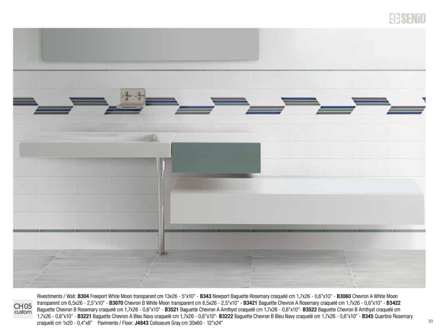 Rivestimento / Wall: B304 Freeport White Moon transparent cm 13x26 - 5”x10” - B343 Newport Baguette Rosemary craquelé cm 1,7x26 - 0,6”x10” - B3060 Chevron A White Moon