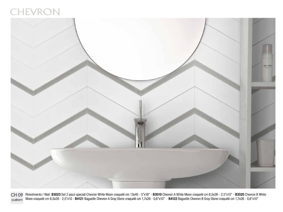 Rivestimento / Wall: B3023 Set 2 pezzi speciali Chevron White Moon craquelé cm 13x45 - 5”x18” - B3010 Chevron A White Moon craquelé cm 6,5x26 - 2,5”x10” - B3020 Chevron B White