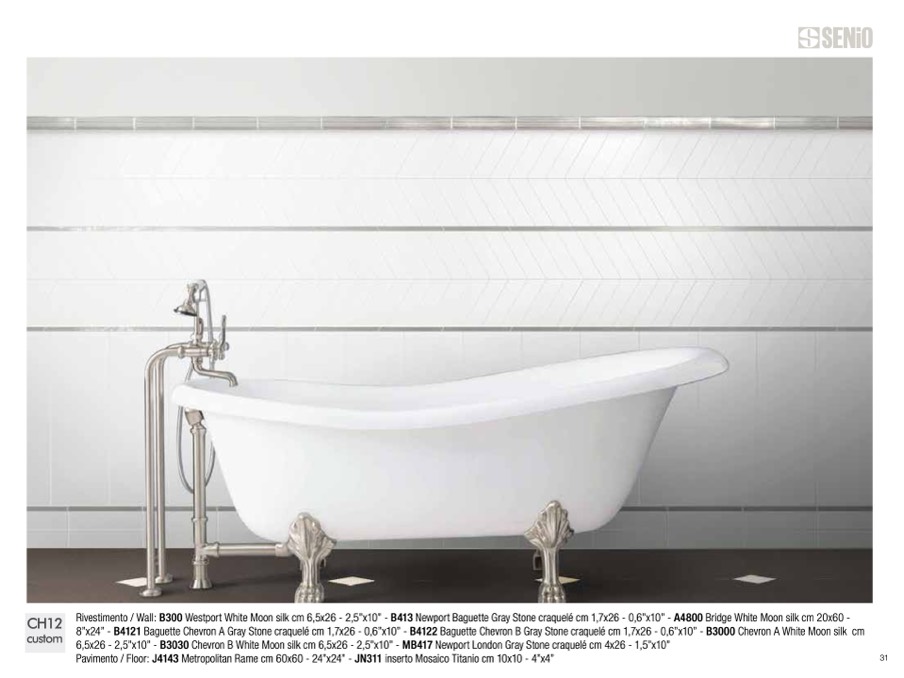 Rivestimento / Wall: B300 Westport White Moon silk cm 6,5x26 - 2,5”x10” - B413 Newport Baguette Gray Stone craquelé cm 1,7x26 - 0,6”x10” - A4800 Bridge White Moon silk cm 20x60 -