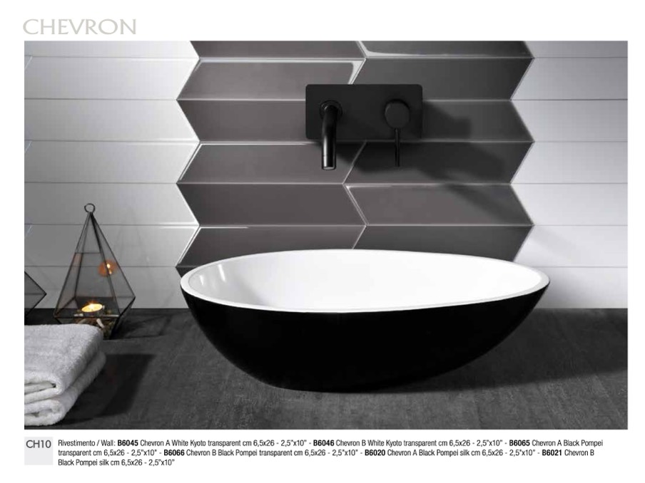 Rivestimento / Wall: B6045 Chevron A White Kyoto transparent cm 6,5x26 - 2,5”x10” - B6046 Chevron B White Kyoto transparent cm 6,5x26 - 2,5”x10” - B6065 Chevron A Black Pompei