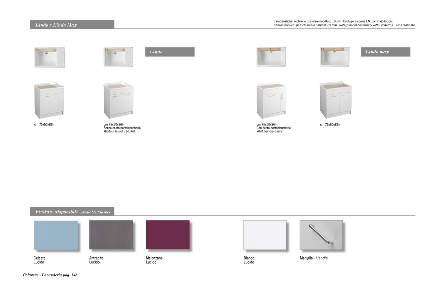 Characteristics: particle board cabinet 18 mm. Waterproof in conformity with EN norms. Gloss laminate.