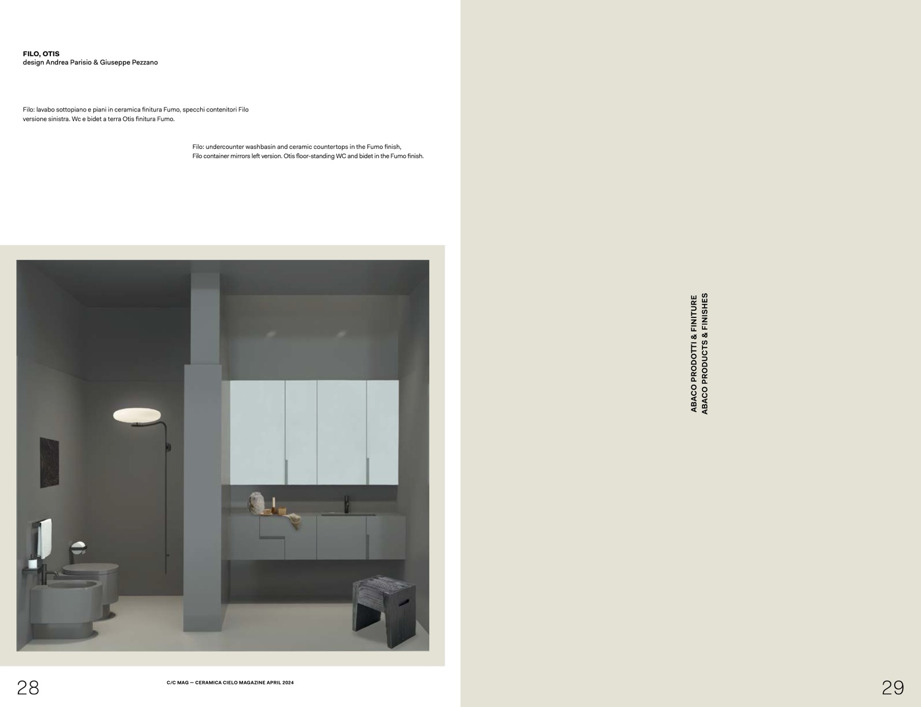 Filo container mirrors left version. Otis floor-standing WC and bidet in the Fumo finish.