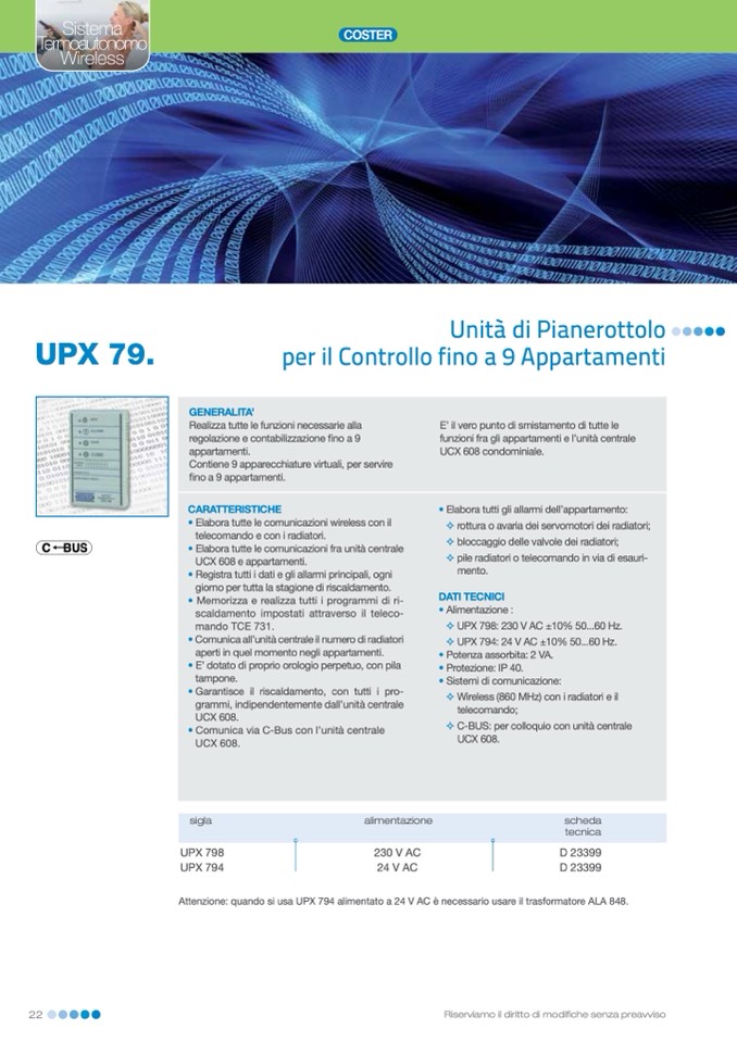 Attenzione: quando si usa UPX 794 alimentato a 24 V AC è necessario usare il trasformatore ALA 848.