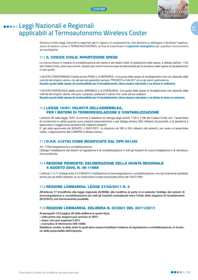 L’articolo 1.4.17 obbliga entro il 01/09/2012 l’installazione di termoregolazione e contabilizzazione, ove tecnicamente possibile,