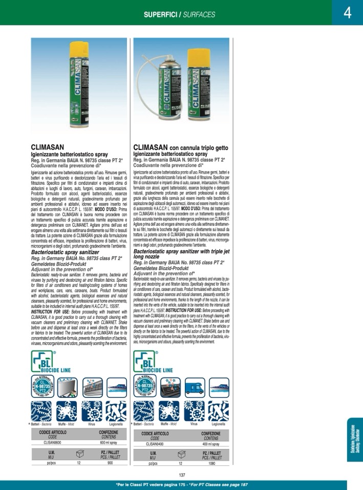 air conditioners of cars, caravan and boats. Product formulated with alcohol, bacte-