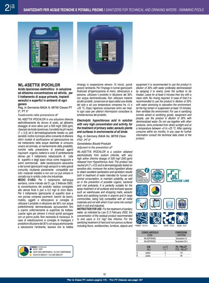 SANITIZZANTI PER ACQUE TECNICHE E POTABILI, PISCINE / SANITIZERS FOR TECHNICAL AND DRINKING WATERS - SWIMMING POOLS