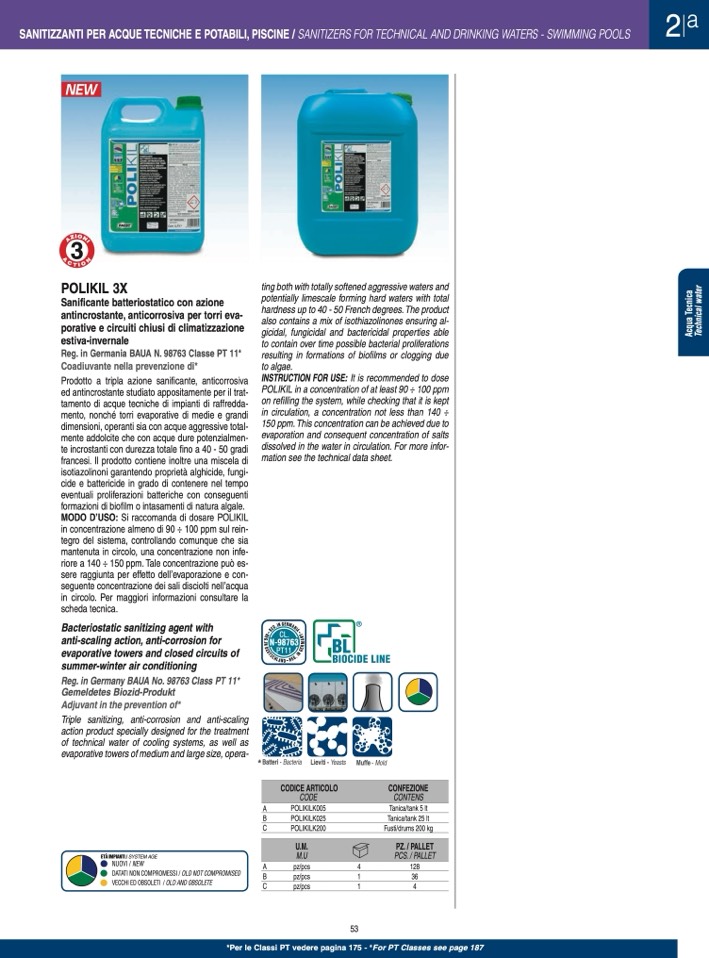 SANITIZZANTI PER ACQUE TECNICHE E POTABILI, PISCINE / SANITIZERS FOR TECHNICAL AND DRINKING WATERS - SWIMMING POOLS