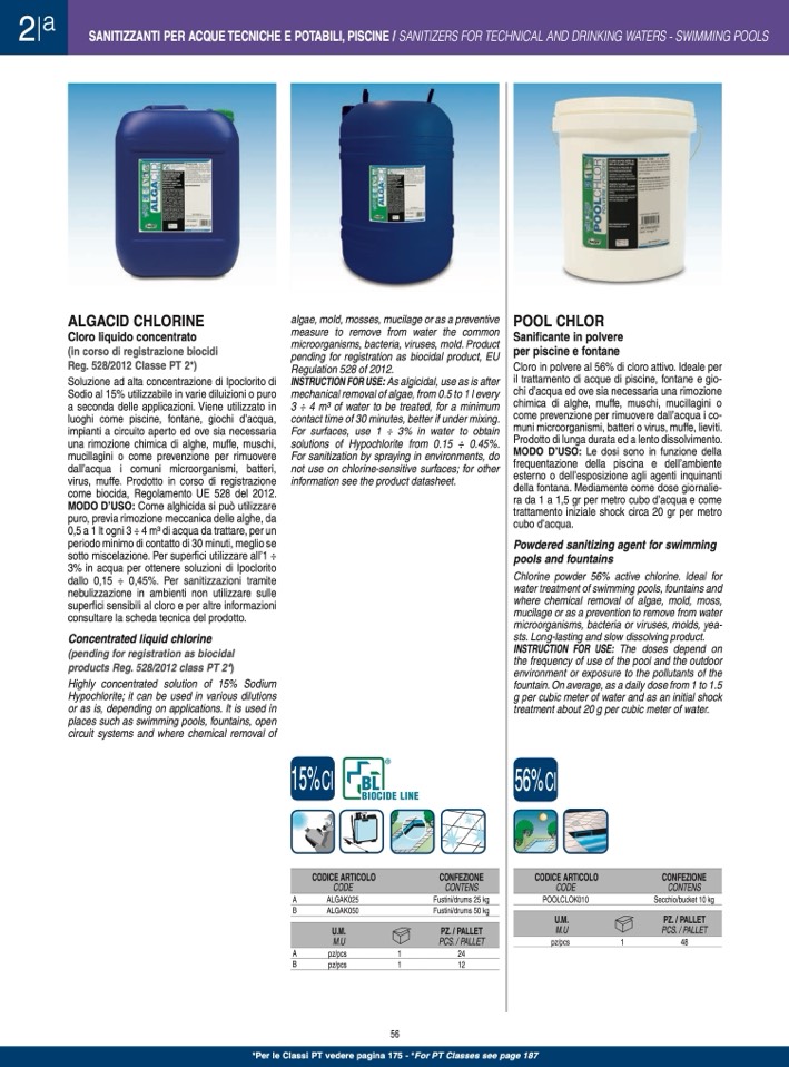 SANITIZZANTI PER ACQUE TECNICHE E POTABILI, PISCINE / SANITIZERS FOR TECHNICAL AND DRINKING WATERS - SWIMMING POOLS