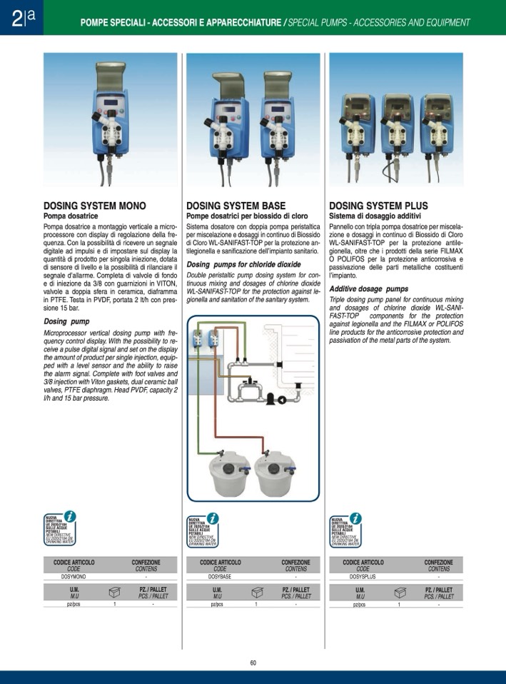 in PTFE. Testa in PVDF, portata 2 lt/h con pres-