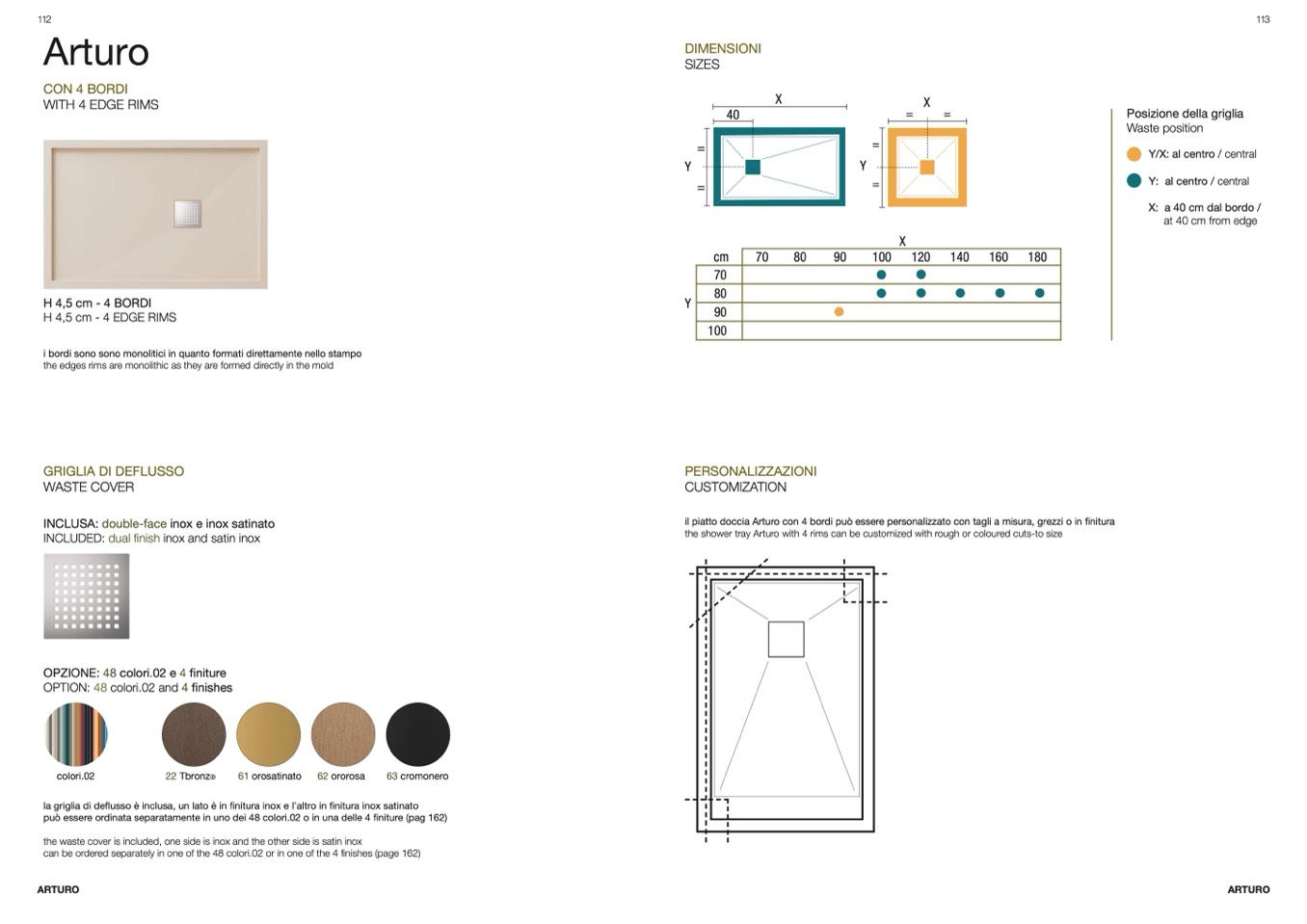 il piatto doccia Arturo con 4 bordi può essere personalizzato con tagli a misura, grezzi o in
