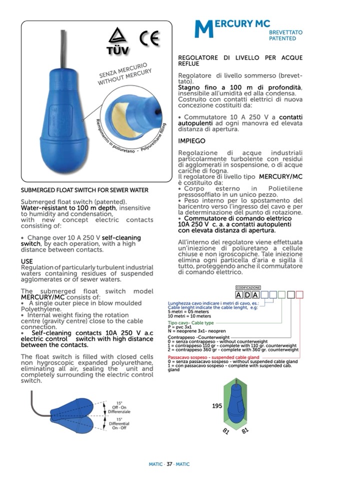 SUBMERGED FLOAT SWITCH FOR SEWER WATER