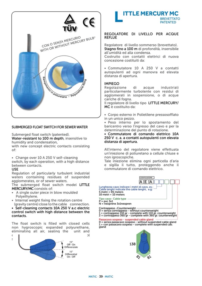 SUBMERGED FLOAT SWITCH FOR SEWER WATER