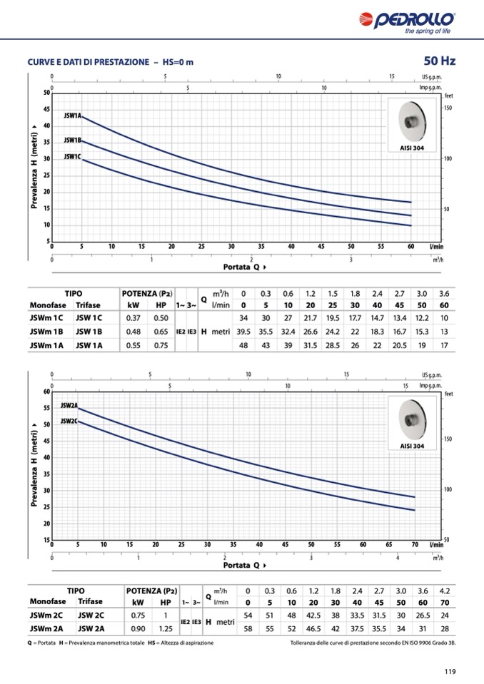 Q = Portata H = Prevalenza manometrica totale HS = Altezza di aspirazione