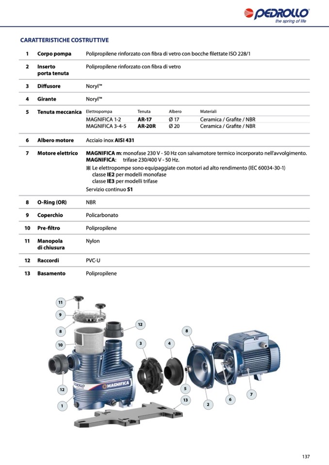 MAGNIFICA m: monofase 230 V - 50 Hz con salvamotore termico incorporato nell'avvolgimento.