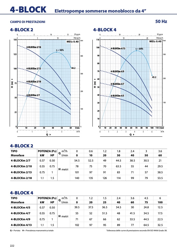 Tolleranza delle curve di prestazione secondo EN ISO 9906 Grado 3B.