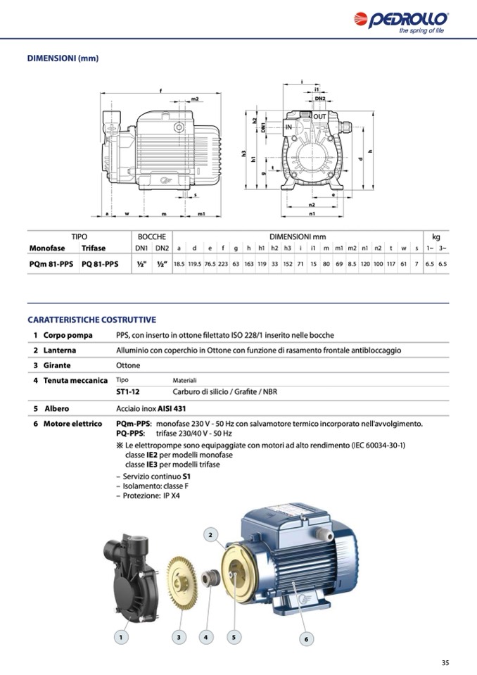 PQm-PPS: monofase 230 V - 50 Hz con salvamotore termico incorporato nell'avvolgimento.