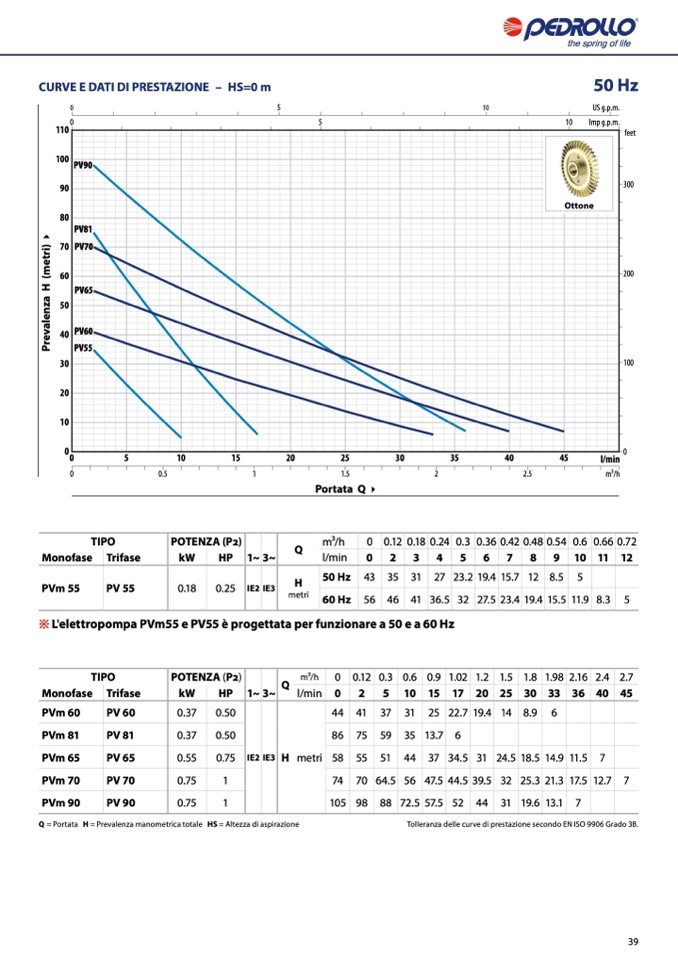Q = Portata H = Prevalenza manometrica totale HS = Altezza di aspirazione