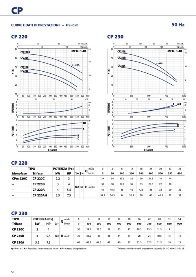 Q = Portata H = Prevalenza manometrica totale HS = Altezza di aspirazione