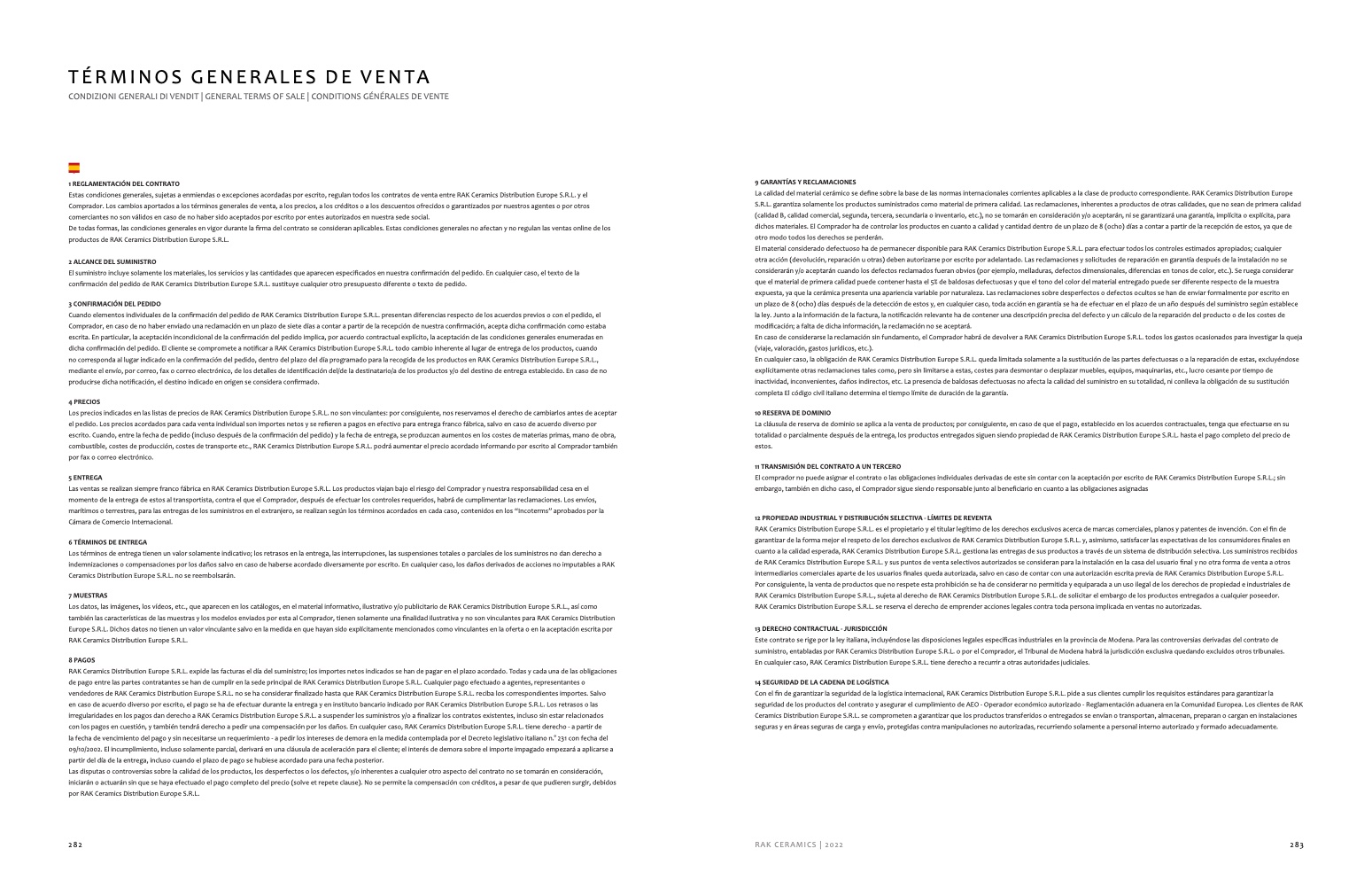 Estas condiciones generales, sujetas a enmiendas o excepciones acordadas por escrito, regulan todos los contratos de venta entre RAK Ceramics Distribution Europe S.R.L. y el