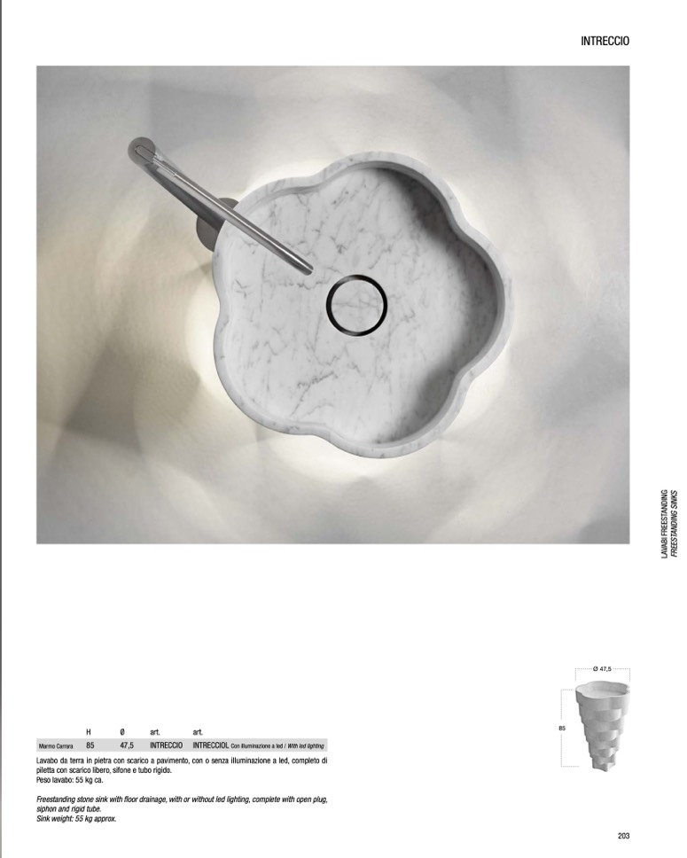 Lavabo da terra in pietra con scarico a pavimento, con o senza illuminazione a led, completo di