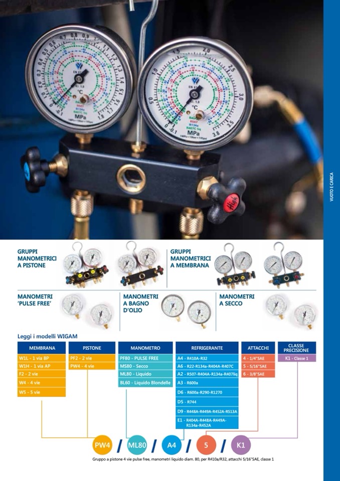 Gruppo a pistone 4 vie pulse free, manometri liquido diam. 80, per R410a/R32, attacchi 5/16”SAE, classe 1