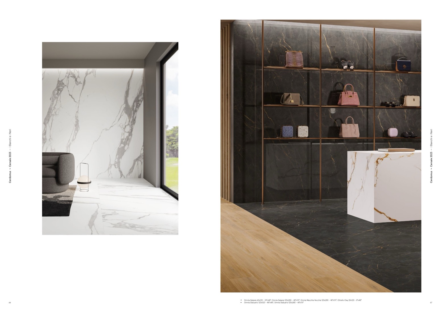 ↑ Omnia Galaxia 60x120 - 24"x48"; Omnia Galaxia 120x280 - 48"x111"; Omnia Macchia Vecchia 120x280 - 48"x111"; Othello Clay 20x120 - 8"x48"