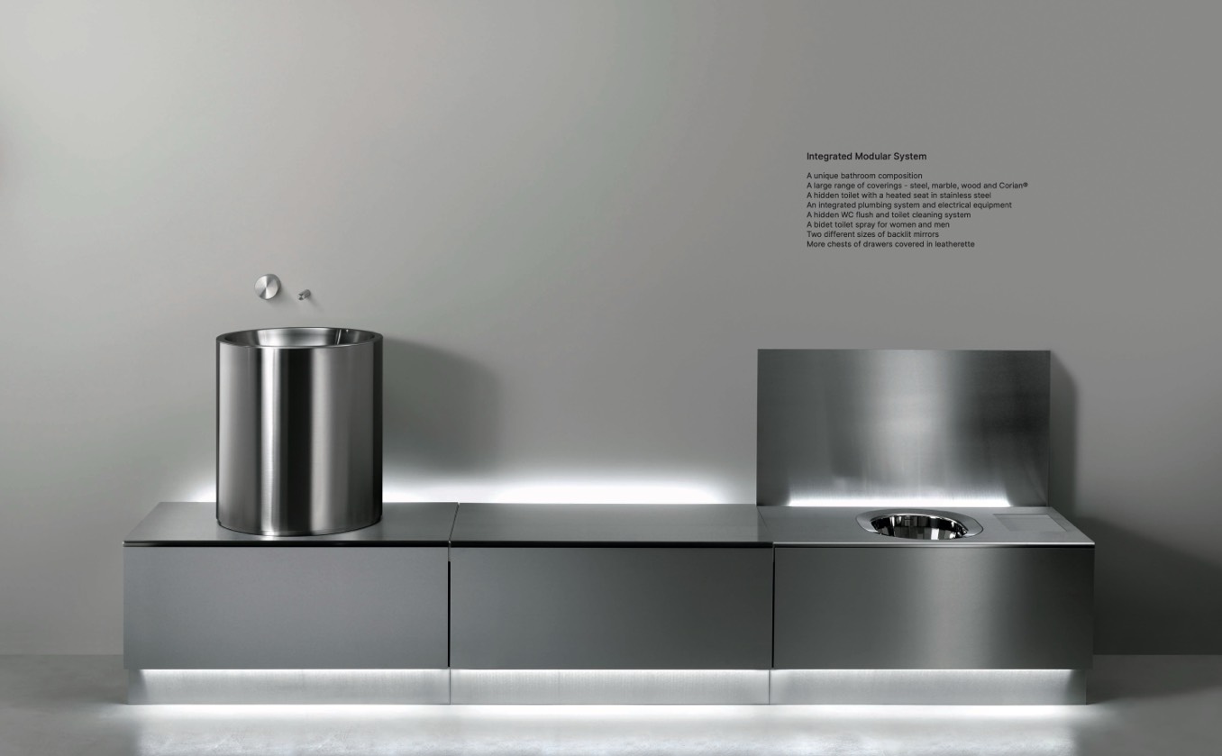 A hidden toilet with a heated seat in stainless steel