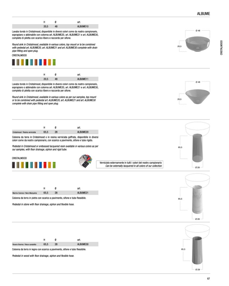 with pedestal art. ALBUME20, art. ALBUME21 and art. ALBUME30 complete with drain