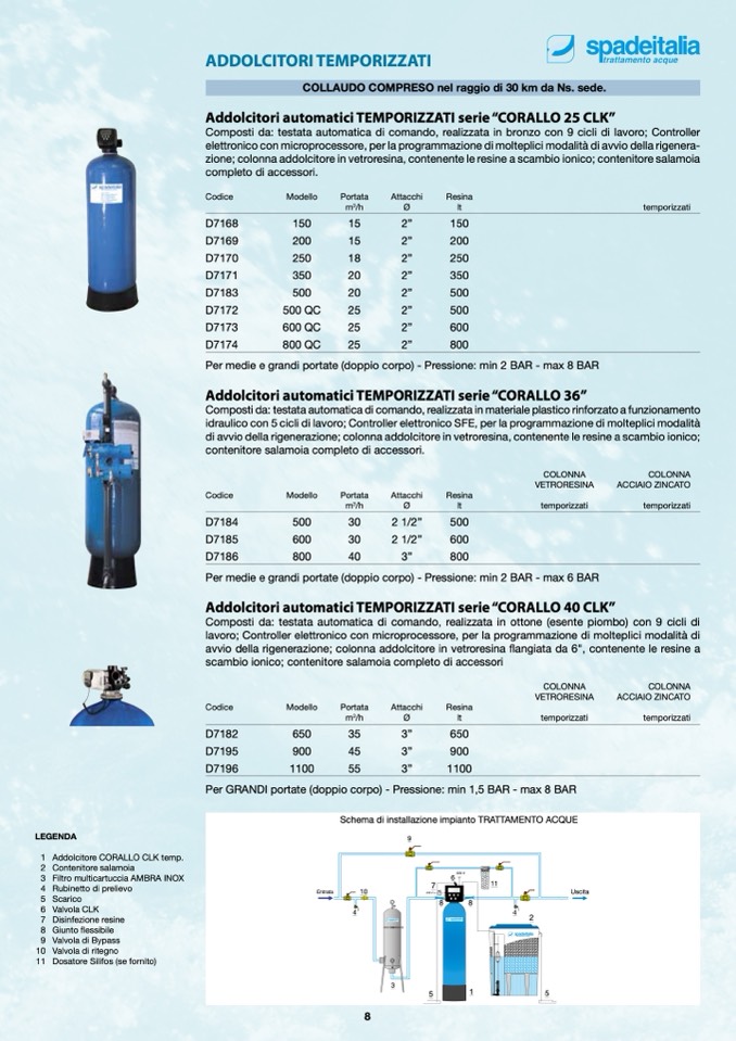 zione; colonna addolcitore in vetroresina, contenente le resine a scambio ionico; contenitore salamoia