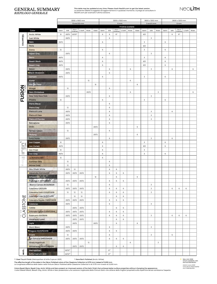 This table may be updated at any time. Please check Neolith.com to get the latest version.