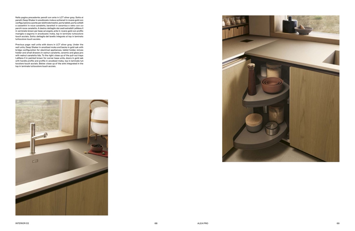 Nella pagina precedente: pensili con ante in LCT silver gray. Sotto ai