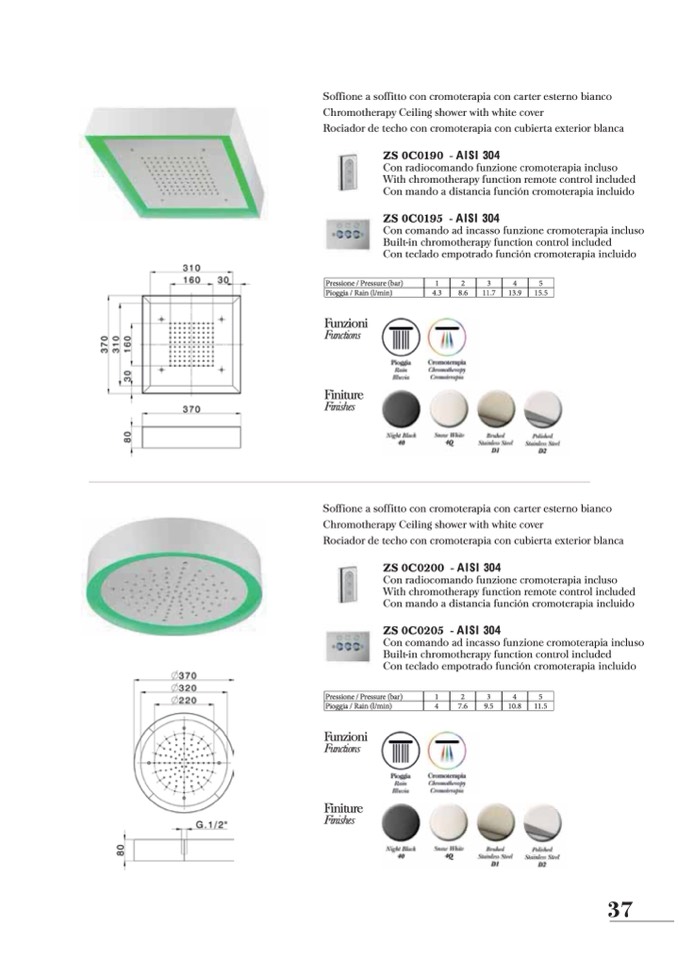 Soffione a soffitto con cromoterapia con carter esterno bianco