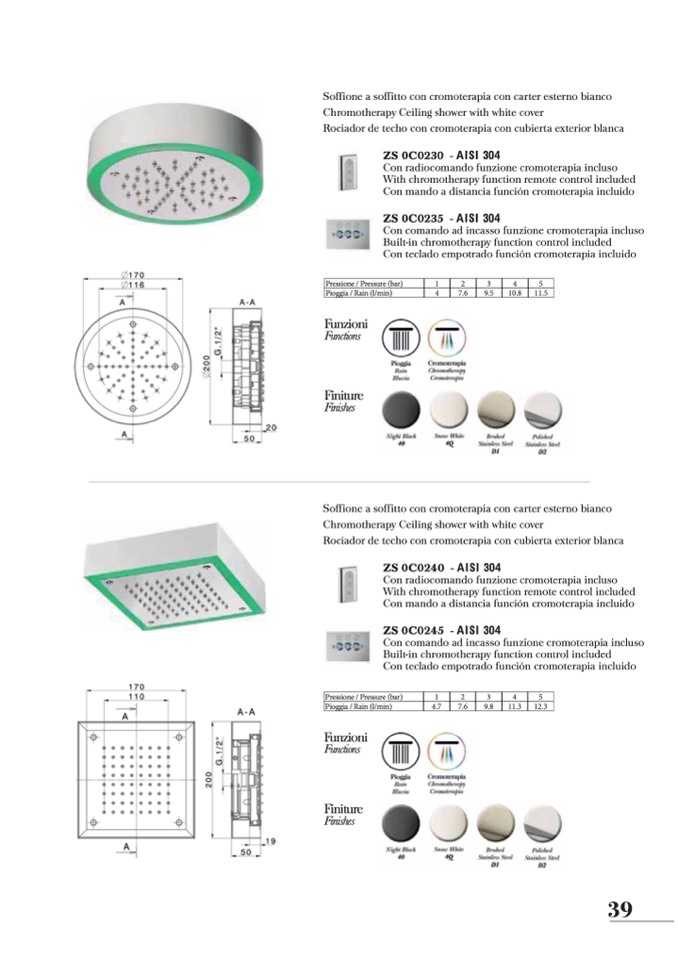 Soffione a soffitto con cromoterapia con carter esterno bianco