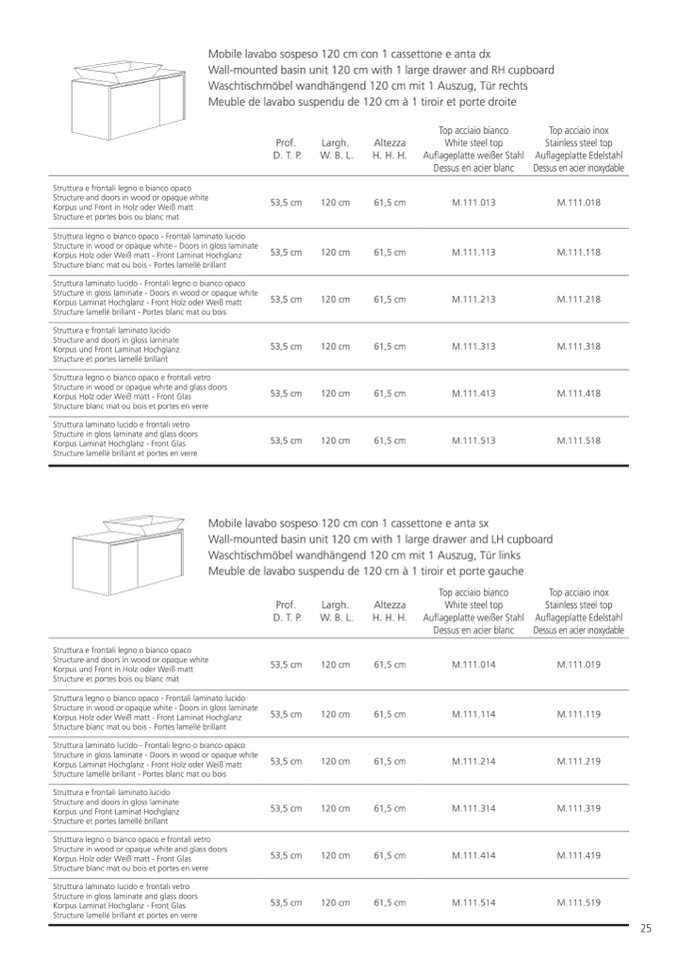 Mobile lavabo sospeso 120 cm con 1 cassettone e anta sx