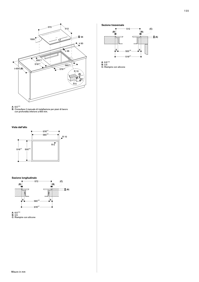 B: Consultare il manuale di installazione per piani di lavoro