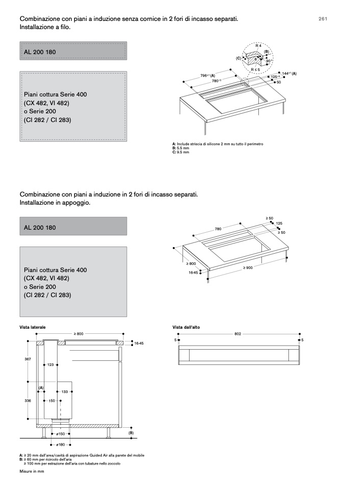 A: ≥ 20 mm dall’area/cavità di aspirazione Guided Air alla parete del mobile